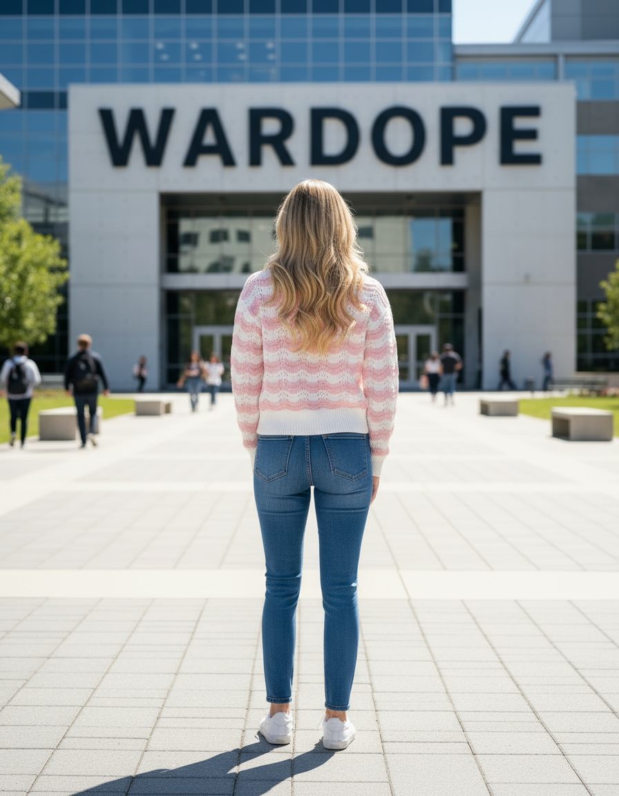 Add a soft, feminine touch to your everyday style with this pink and white wavy knit sweater. Designed with delicate wave patterns and a cozy ribbed finish, it offers both warmth and charm. The pastel tones and relaxed fit make it a perfect choice for casual outings or cozy weekends.